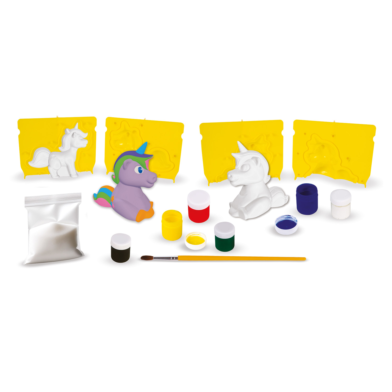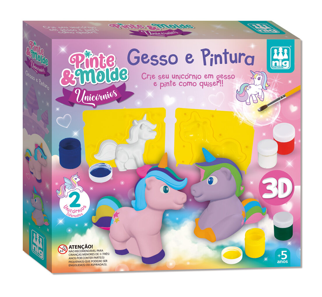 O kit Pinte & Molde Unicórnios traz a mágica das peças em gesso produzidas de forma simples e divertida! Misture gesso e água, coloque nos moldes e espere secar.